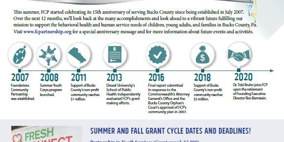 Aug42021Latest NewsFCP News - Summer 2021 Click below to view full issue: Category: Latest NewsBy dwdadminis1August 4, 2021Post navigationPreviousPrevious post:Practical Counseling Strategies and Interventions for Children and Teens Struggling with Pandemic-Related StressorsNextNext post:Presenter Provides Essential Tools to Address the Critical Issue of Youth SuicideRelated PostsFCP Meets this Moment of Need by Increasing Grant SupportOctober 18, 2025FCP Introduces Rapid Response Fund as it Opens Fall Grant Cycle to NonprofitsAugust 29, 2025College Students Spend Their Summer Helping Local NonprofitsAugust 7, 2025FCP Accepts Applications for Semi-Annual Partnership in Youth Services Grant CycleJuly 15, 2025FCP Board Awards Nearly $180,000 to Local Nonprofits as Demand SurgesJuly 2, 2025FCP Awards $25,000 in Scholarships to Outstanding Bucks County StudentsJune 26, 2025