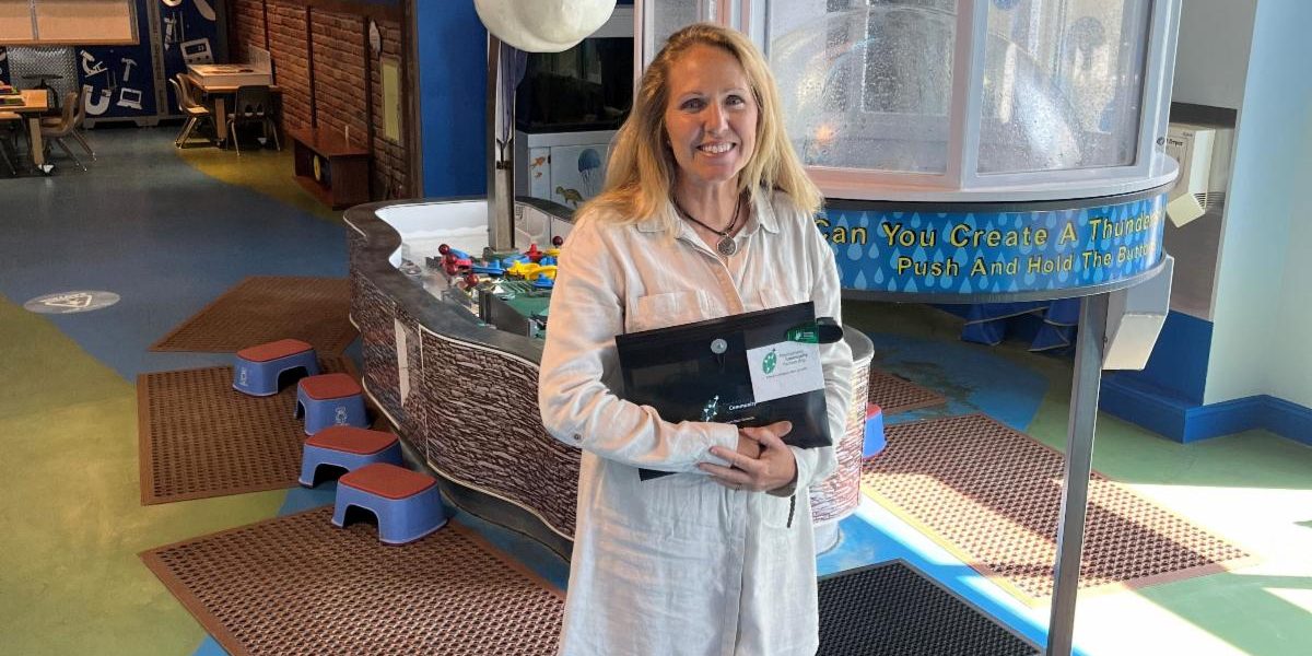 Photo caption: Kelly Krumenacker, President and Executive Director of the Bucks County Children’s Museum, accepts a grant award from Foundations Community Partnership to help upgrade the popular water table she stands in front of.