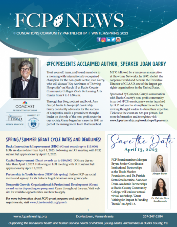 FCP Appoints New Board Member FOR IMMEDIATE RELEASE Contact: Beth Brody 609-397-3737, bebrody@aol.com Doylestown, PA (October, 2014) — Foundations Community Partnership, a non-profit foundation supporting the behavioral health and human…
